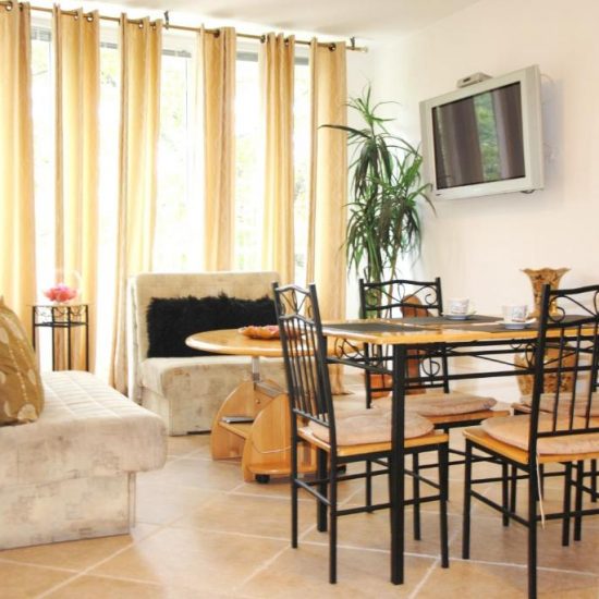 U sobi: Svi naši savremeni apartmani i dva dvosobna apartmana  sa velikom polupokrivenom terasom imaju klimu, digitalnu sat.tv (1000 programa) voda non-stop, skoro svi sobne sefove, opremeljenu kuhinju . Kućni ljubimci su dozvoljeni.