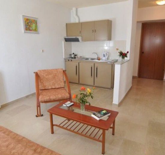 Smeštaj: Apartmani se sastoje od dnevno spavaće sobe sa kuhinjskim delom u kojima se nalazi sofa na razvlačenje i trpezarijski sto, u spavaćoj sobi se nalaze dva standardna ležaja.